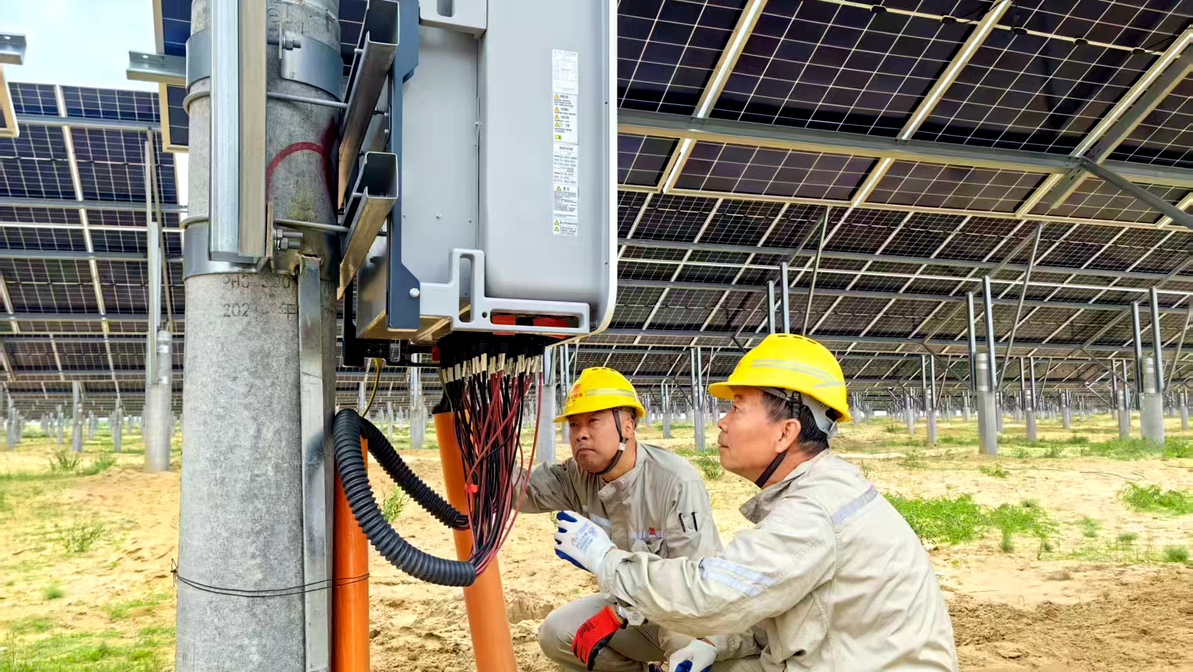 当我有幸成为其中一员,真正走近他们身边,才得以亲身体验这群追光人在9月的别样工作与生活。聊起近况,他们立刻打开了话匣:“王欣,你刚到这儿,9月的沙漠早晚凉,可得多穿件衣服。工作上嘛,更要守规矩、保安全,认真仔细把活儿干好——每一块光伏板都高效运转,咱们才能安心。生活里咱就热热闹闹的,晚上一起煮碗热汤,跟一家人似的。”走出升压站,眼前便是一望无际的光伏区,数万块蓝色组件整齐排列,如同一面面挺括的旗帜,在沙海中傲然矗立。光伏板与箱变间的距离不远,仿佛手手相牵;可对运维人员来说,要在一个月内给1443亩土地上的16台箱变、成百上千台逆变器和组件做两次全面巡查,这事看似简单,做起来却绝非易事。