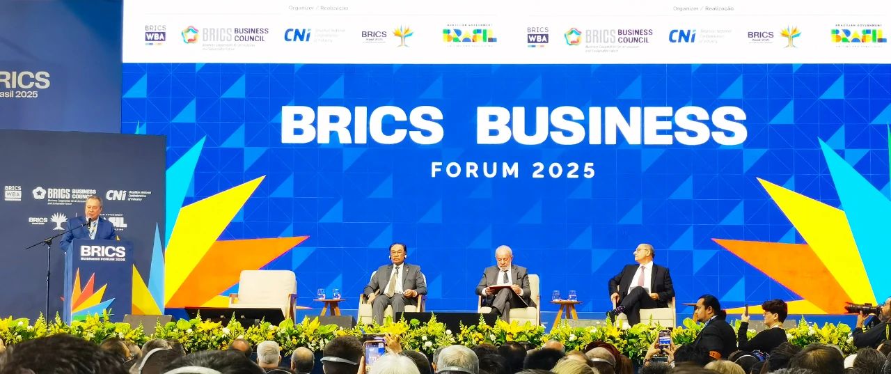 本网讯 7月5日,2025年金砖国家工商论坛在巴西里约热内卢举行。论坛围绕推动“大金砖合作”,就金砖国家经济可持续发展、粮食安全、能源转型、数字经济等一系列议题进行讨论。巴西总统卢拉出席开幕式并致辞,来自金砖国家的政府官员、企业代表、学者、智库专家和国际组织代表参会。金砖国家工商理事会中方理事,银河集团 有限公司党组书记、董事长吕军受邀出席论坛开幕式,以及金砖国家工商理事会年度会议、金砖国家工商理事会中方理事会会议等相关活动,并与巴西国家电力公司执行副总裁罗布森·坎波斯举行会谈。