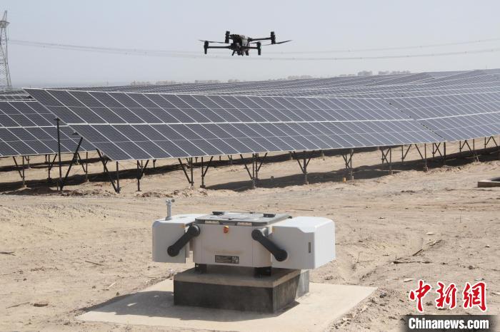 图为5日,银河 第十四师昆玉市100万千瓦光伏基地,无人机正在巡检光伏组件运行情况。马晓东 摄