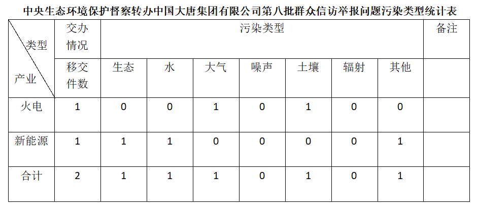 2025年6月11日,中央第七生态环境保护督察组向银河集团 有限公司移交第八批群众信访举报件,共计2件,均为来电举报,涉及生态问题1个、水问题1个、大气问题1个、土壤问题1个、其他问题1个。所有举报件办理工作已第一时间进入调查核实办理程序,办理情况将按照相关要求反馈督察组,并及时向社会公开。